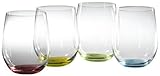 Riedel's new Happy O line is a colorful take on the company's popular O line of stemless wine tumblers. Each of the four tumblers in this set features a different colored base: red, green, yellow, and blue. When used for water or white wine, the color visually diffuses into the liquid in an appealing manner. Great for entertaining, the individual colors also allow guests to tell which glass is theirs. Riedel uses the Viognier/Chardonnay tumbler for this set, a versatile size and shape that holds a maximum of 11-1/8 ounces and stands 3-7/8 inches tall. Riedel took the wine world by storm with its trend-setting O line. By removing the stems from wine glasses, Riedel created tumblers that are less likely to break and are more storable in compact kitchens, great for today's lifestyles. The Happy O tumblers are crafted in Bavaria of non-lead crystal, and while dishwasher-safe, they are best washed by hand. --Ann Bieri.../ Riedel Happy O Wine Tumblers, Set of 4 / Glasses Wine Oh, Happy O! Perfect for celebrations or everyday use, these Riedel Happy O glasses are Riedel's Viognier/Chardonnay model, with the bases in assorted fluorescent colors; green, yellow, blue and red. These Happy O glasses come as a set of four: one of each color..../ Riedel Happy O Wine Tumblers, Set of 4 / Glasses Wine